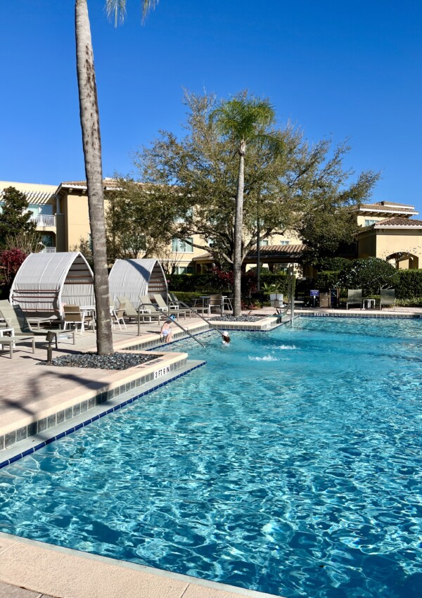 There’s a little hallway to the left that has the bathroom, plus a closet built into the wall. Turn right and there’s the door to exit the room and go down the stairs to the pool area and the beach.