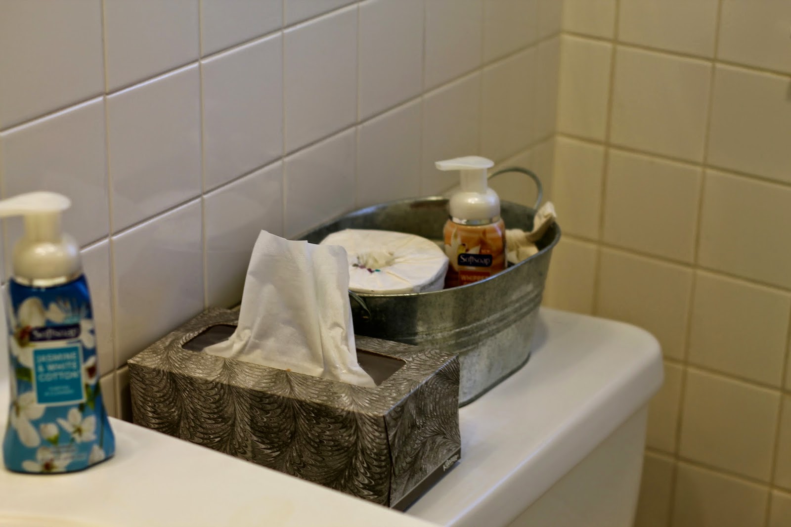 The upstairs bathroom obviously got Jasmine and White Cotton for its blue and white bottle, and I grabbed the Whipped Cocoa Butter as a backup. I have a cocoa butter lotion I’ve been using for years, and I love the smell, so this one went into the basket, too. I’m trying to do a better job of not stocking up too much on items, so I’m using a galvanized pail to hold “extras”. That way I will know I have a backup (and exactly where it is).