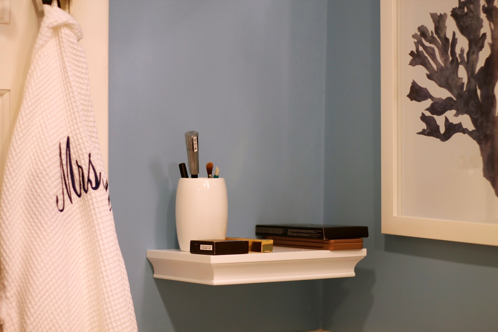 Love the blue bathroom and that shelf is simple but brilliant! The Foaming Softsoap definitely matches! #client