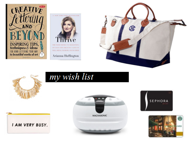 I’d love to learn calligraphy, so a book on the basics is a necessity. Arianna Huffington’s book “Thrive” is also on my wish list (but the Kindle version, so I can take it with me while I’m commuting back and forth to work). I’m all about monograms, so a weekender (as well as a scarf, necklace, sweater, and throw) are there. Gift cards to the two places where I feel like I spend all of my money are necessary, as well as a jewelry cleaner because I’m terrible at keeping my engagement ring and wedding band as sparkly as they deserve to be! And a fringe bracelet (which also has a matching necklace available!) with this fun pouch round out my list. Oh, also, I’d like T to allow me to foster all of the homeless dogs (for some reason he keeps telling me I cannot).