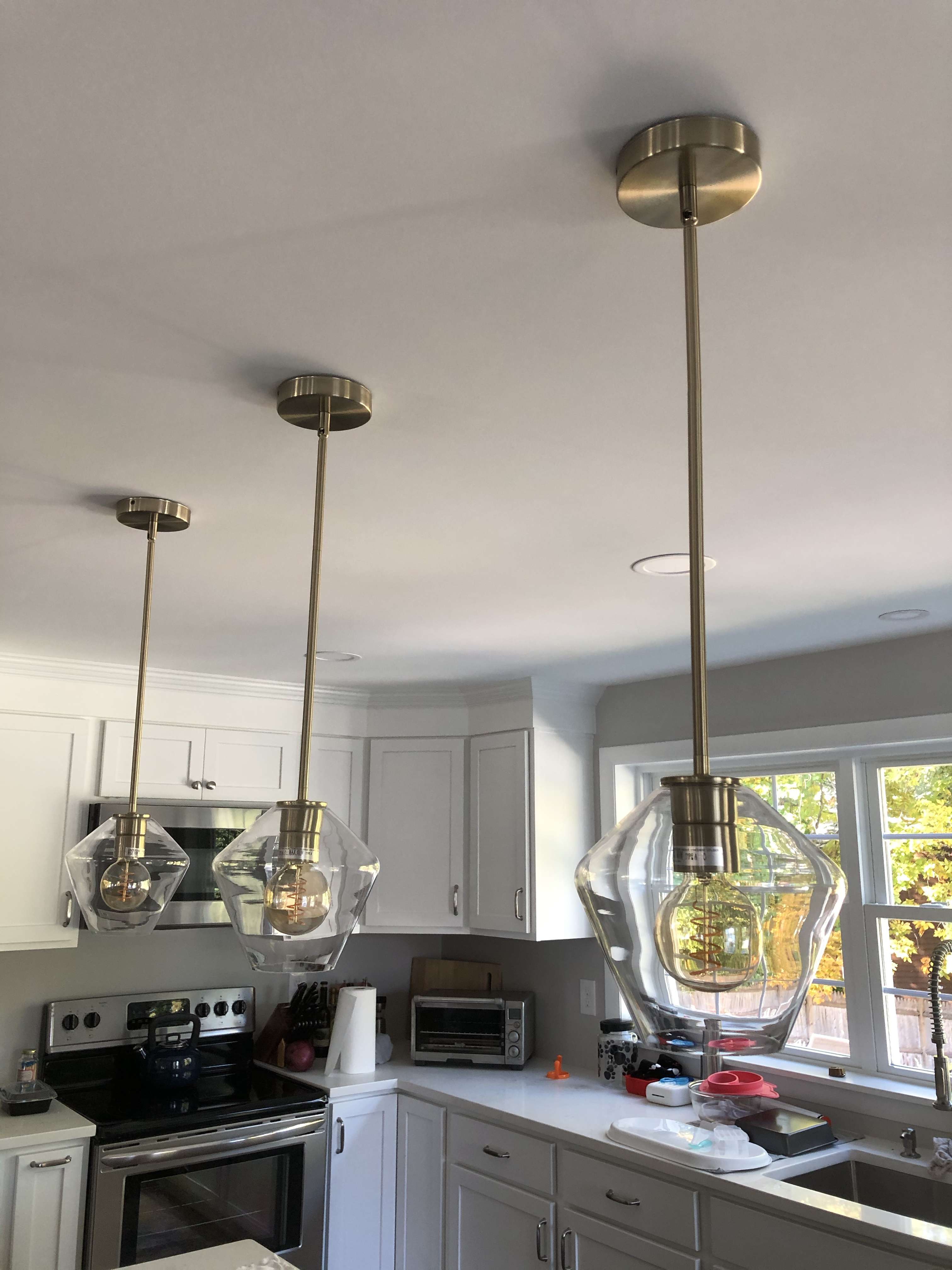 Now let’s talk about the pendant lights. I knew the general style I wanted for the kitchen lights, but I had the hardest time finding that style for sale. I like mixing metals in the kitchen, but I wanted to mix the stainless steel of the sink and cabinet hardware with a champagne color light (not full on brass). I found these pendant lights at one store, and I found the shades at another (the shade is the “Geo” style).