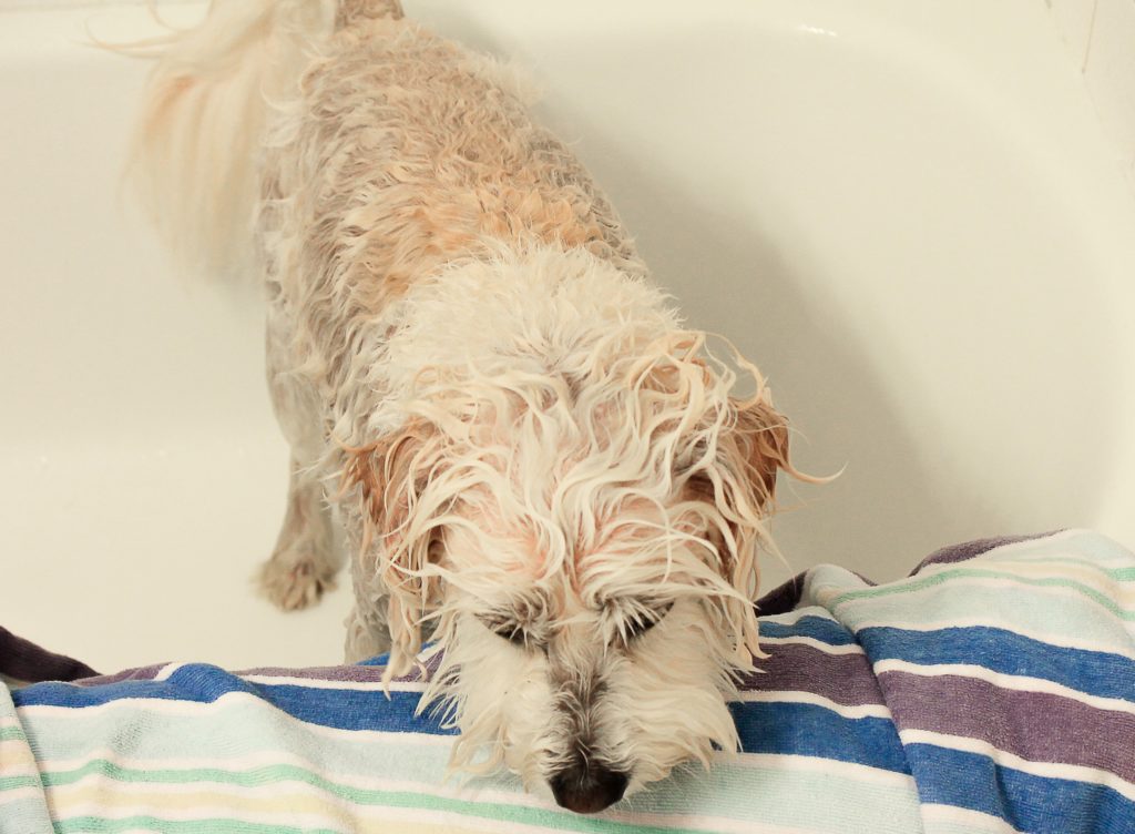 I don’t know how your bathtimes go with your pups, but Sprout is not a fan of having the water pour directly on him, which means that I’m constantly coaxing him back toward the water spout so I can rinse off all of his shampoo. When Moen asked if I wanted to try the new Propel handheld shower head, I thought how much easier would that be – I can use the handheld piece and bring the water to Sprout instead of trying to bring him back towards the water (usually from the other side of the tub) – which cuts bathtime in half. (Sprout says thank you for that!)